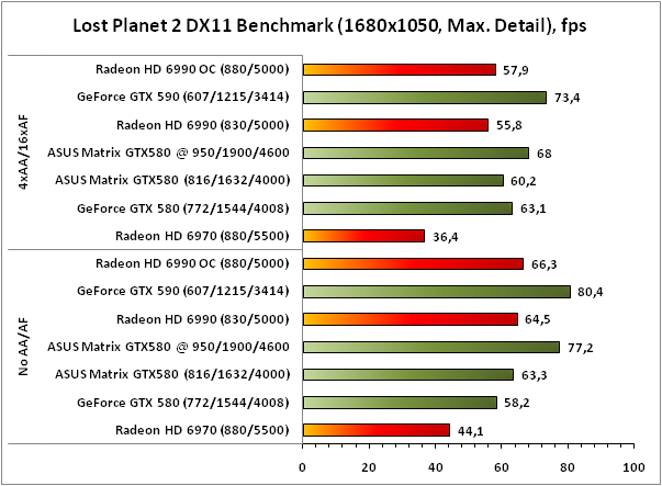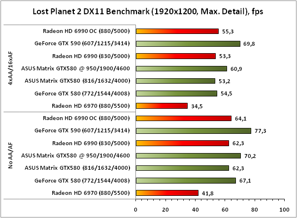 Как и Far Cry 2, игра Lost Planet 2 в некоторых случаях демонстрирует деградацию результатов ASUS Matrix GTX580 Platinum в сравнении с показателями эталонной версии GeForce GTX 580, и это при более высокой частоте GPU видеокарты ASUS. Как мы уже говорили, объяснить подобное поведение видеокарты можно лишь сменой версии драйверов. Однако, даже несмотря на это, после ручного разгона Matrix GTX580 Platinum обходит двухчиповые флагманские продукты AMD.