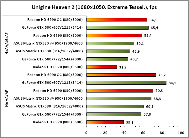 | Unigine Heaven 2.0 | Максимальная детализация, тесселяция в режиме Extreme, 1920x1200/1680x1050 no AA/AF Максимальная детализация, тесселяция в режиме Extreme, 1920x1200/1680x1050 4xAA/16xAF |