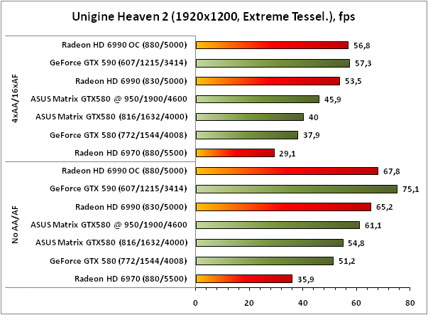 В Unigine Heaven 2 наблюдается вполне закономерный рост результатов после увеличения тактовых частот ASUS Matrix GTX580 Platinum, однако этот ускоритель сумел приблизиться к показателям производительности Radeon HD 6990 лишь однажды — в самом лёгком режиме.