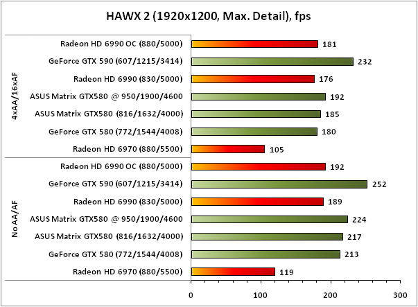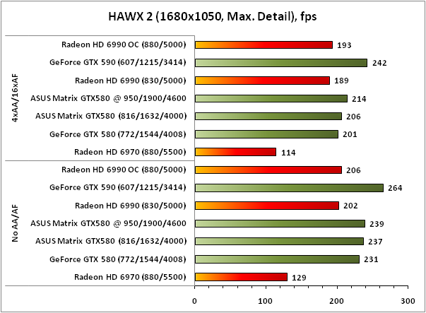 В HAWX 2 мы стали свидетелями парада решений NVIDIA. Первое место, разумеется, за GeForce GTX 590, а вот оставшиеся два призовых места занял ускоритель ASUS Matrix GTX580 Platinum.