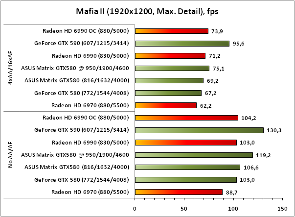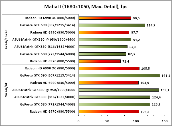 Результаты, полученные при тестировании видеокарт в игре Mafia II, впечатляют. Ускоритель ASUS Matrix GTX580 Platinum после разгона обходит всех конкурентов, за исключением GeForce GTX 590, который всё ещё оказывается быстрее.