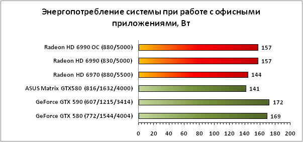 Что касается энергопотребления, то и здесь продукт ASUS опережает эталонное решение. Благодаря оптимизации работы системы питания и использованию высококачественных элементов, энергопотребление системы с установленной видеокартой ASUS Matrix GTX580 Platinum меньше оного у той же системы с эталонной видеокартой GeForce GTX 580.