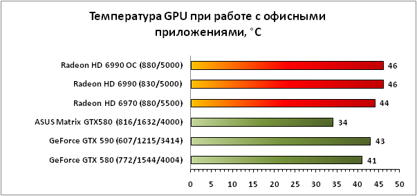 Массивность конструкции системы охлаждения ASUS Matrix GTX580 Platinum позволяет владельцам этого ускорителя вполне справедливо рассчитывать на лучший температурный режим GPU. Наши тесты показали, что такие надежды более чем оправдываются. Даже несмотря на более высокие рабочие частоты ASUS Matrix GTX580 Platinum, графический процессор этого ускорителя под нагрузкой прогревается заметно слабее, чем эталонная GTX 580 со штатной системой охлаждения: разница достигает целых 10°C! При всём при этом «матричная» система охлаждения шумит не сильно и не выделяется из общего шума системы.