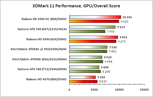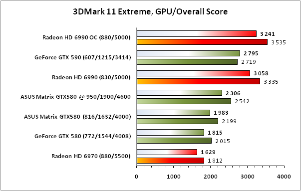 C переходом к режиму DX11 в 3DMark 11 разогнанный ускоритель Matrix хоть и не поравнялся с двухчиповыми продуктами AMD, зато смог приблизиться к показателям производительности GeForce GTX 590, более того, в режиме Performance — даже обойти его.