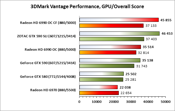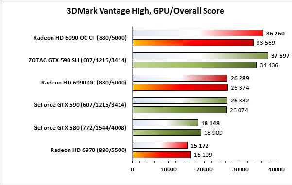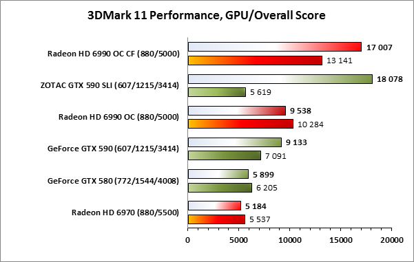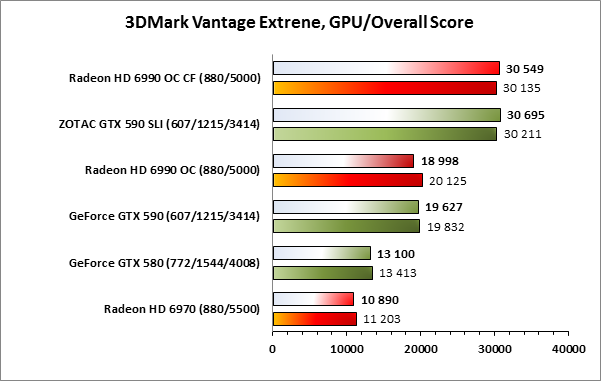 Соотношение сил при сравнении сопоставимых по классу решений сохраняется как в случае с одночиповыми решениями, так и в случае со связками из двухчиповых. Видеокарта GeForce GTX 590 опережает Radeon HD 6990 OC, равно как и ускорители ZOTAC GeForce GTX 590, работающие в SLI, показывают лучший результат в сравнении с Radeon HD 6990 OC CF.