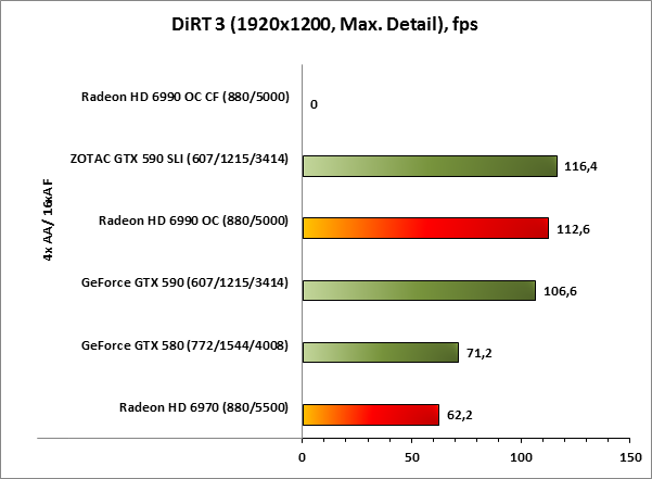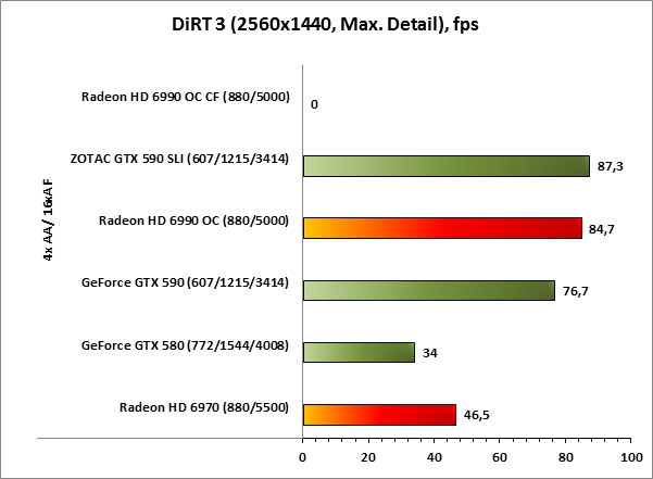 Наверняка многие из вас знают, что игра DiRT 3 создавалась при активном участии AMD, однако, несмотря на это, мы нашли в работе игры ряд недостатков, которые проявляются на ускорителях Radeon. Итак, на системе со связкой из двух Radeon HD 6990 OC, при попытке запустить встроенный бенчмарк или проехаться по трассе игра просто вылетает. Именно поэтому на графиках результаты Radeon HD 6990 OC CF нулевые.