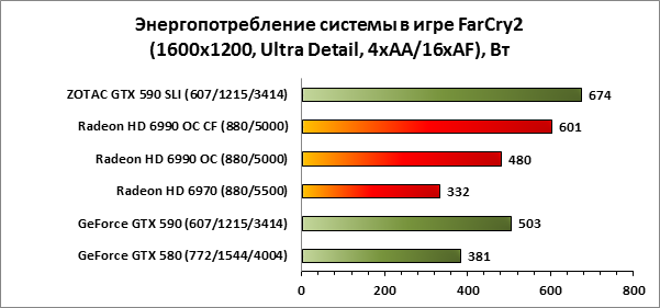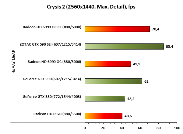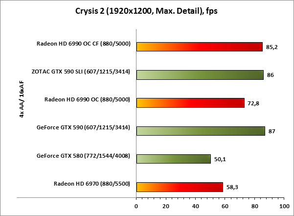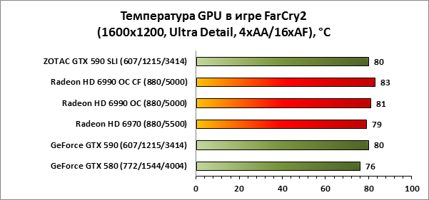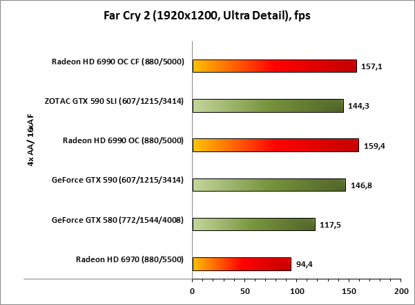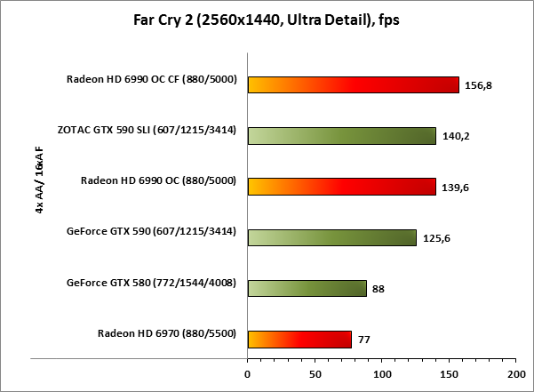 Старичок Far Cry 2 в этот раз удивил. Вопреки ожиданиям, с последними на момент тестирования драйверами AMD, результаты AMD Radeon HD 6990 OC CF оказываются лучше, чем то, на что способна связка ZOTAC GeForce GTX 590 SLI.