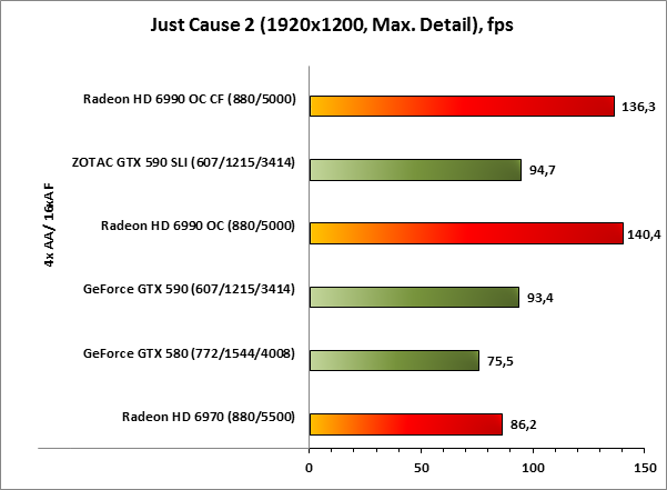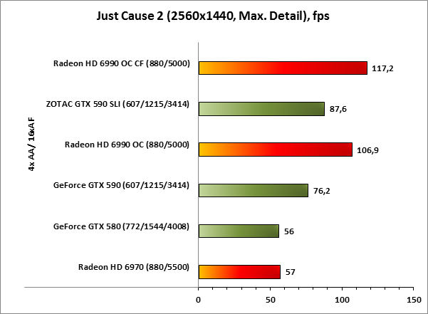 А вот Just Cause 2 сюрпризов не преподнёс. Всё как и прежде — впереди AMD. Даже двухчиповый монстр Radeon HD 6990 OC «делает» четыре чипа GF110.