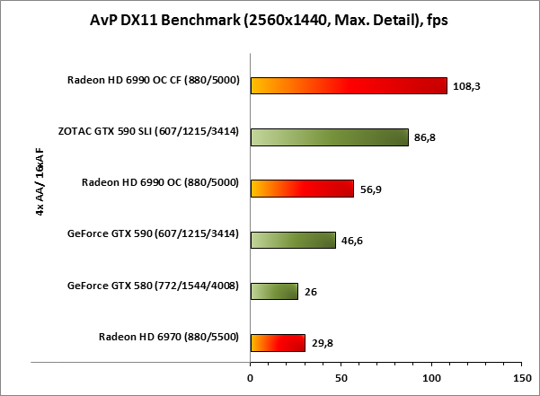 В игре Alien versus Predator ускорители AMD Radeon HD 6990 OC демонстрируют прекрасную масштабируемость результатов при активации CrossFireX! Смотрите сами, почти двукратный прирост производительности! Впрочем, по качеству масштабирования ускорители GeForce GTX 590, работающие в SLI, тоже не отстают, однако абсолютные показатели скорости ниже, чем у одноклассников AMD.