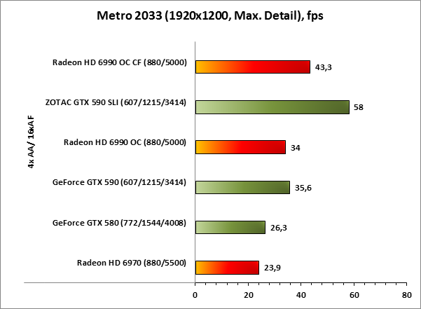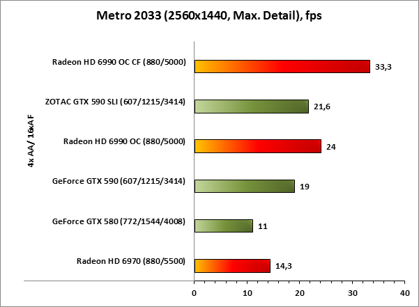 И всё-таки удивительная вещь — драйверы. Качественная оптимизации кода может возвысить не самую мощную железку, а плохой код — наоборот, задушить даже мощнейший флагманский ускоритель. Уверенная победа ZOTAC GeForce GTX 590 SLI в разрешении 1920x1200 сменяется поражением при переходе к 2560x1440, более того, в этом разрешении пара топовых моделей NVIDIA не способна показать достойный результат во встроенном в игру бенчмарке. Мы более чем уверены в том, что такое поведение связано с ошибками оптимизации драйверов, поскольку повторное тестирование, как и переустановка ПО видеокарт, не повлияло на итоговый результат. Что же, по очкам в Metro 2033 между красными и зелёными — ничья.