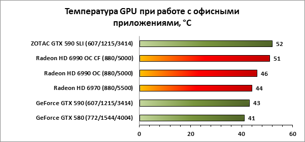 При тестировании дорогих тандемов из нескольких видеокарт мы уже не раз говорили о необходимости организации качественного охлаждения видеосистемы. Как можно догадаться, установленные видеокарты греют не только воздух вокруг себя, но и друг друга, так что хороший обдув прилегающего к ним пространства обязателен. Интересно, что в режиме холостого хода самый горячий GPU на паре ускорителей ZOTAC GeForce GTX 590 прогрелся до 52 градусов, что на 1 градус хуже, чем у ускоренной версии Radeon HD 6990 CF, а вот под нагрузкой ситуация несколько иная. Обычно холодные карты AMD в этом тесте показывают результат худший, чем у GeForce GTX 590 SLI от ZOTAC. Справедливости ради отметим, что в режиме холостого хода разница в температуре не в пользу зелёных мало на что влияет, а вот 3 градуса в режиме игровой нагрузки — это уже заметнее. С формальной точки зрения по температурным показателям карты AMD Radeon HD 6990 в CrossFireX смотрятся неидеально.