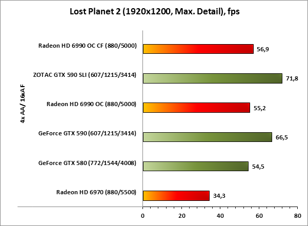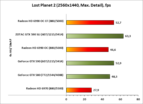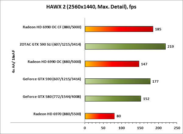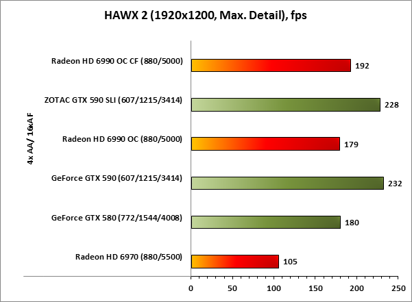 В игре HAWX 2 любой из участников нашего теста, даже «малыш» Radeon HD 6970 показывает прекрасную производительность в максимальном разрешении. В лидерах ZOTAC GeForce GTX 590 SLI, следом, как и предполагалось, Radeon HD 6990 OC CF.