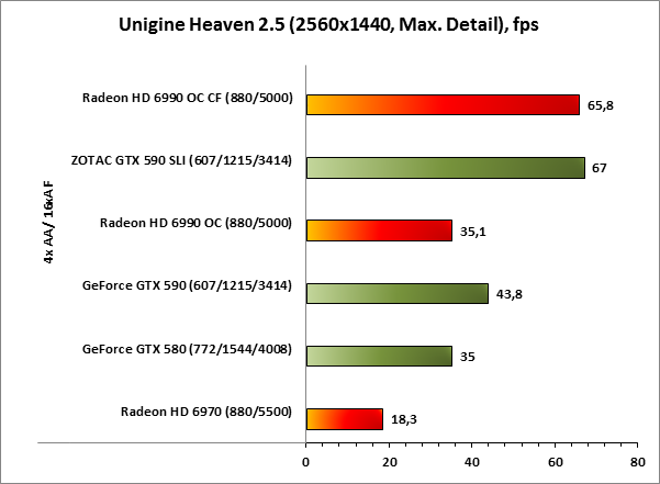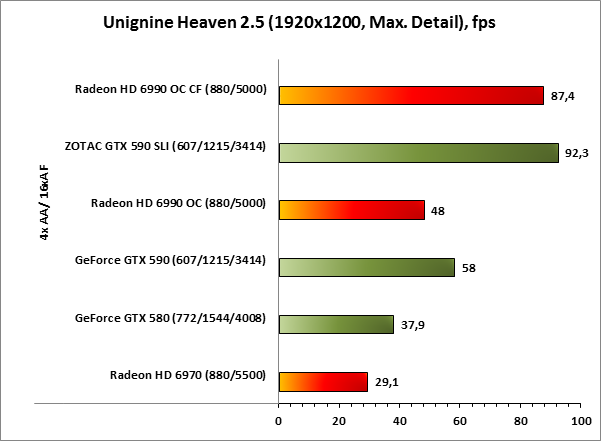 В Unigine Heaven 2.5 борьба двухчиповых ускорителей GeForce GTX 590 и Radeon HD 6990 оканчивается победой NVIDIA, а вот при переходе к парным видам спорта картина немного меняется. Да, ускорители ZOTAC на базе GPU NVIDIA по-прежнему впереди, однако разница в производительности с Radeon HD 6990 OC CF минимальна.