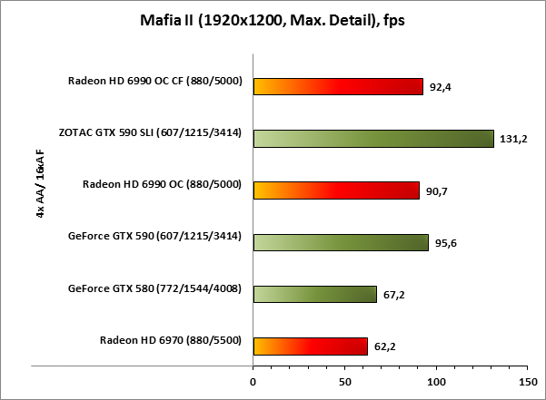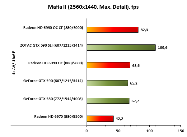 В игре Mafia II масштабируемость результатов у видеокарт AMD Radeon HD 6990 OC, работающих в CrossFireX-связке, находится на очень низком уровне, что негативно сказывается на позиции этого тандема относительно ZOTAC GeForce GTX 590 SLI, который показывает отличный результат.