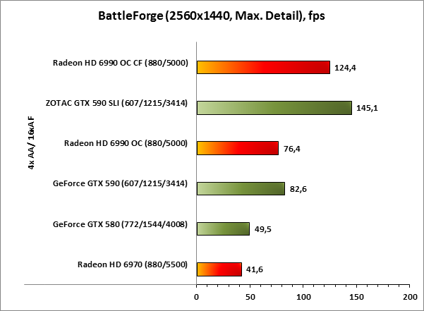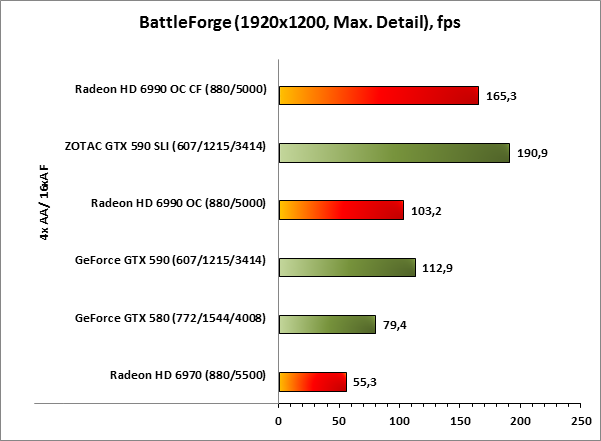 | Battleforge DX 10 | Максимальная детализация, 1920x1200/ 1680x1050 no AA/AF Максимальная детализация, 1920x1200/ 1680x1050 4xAA/AF |