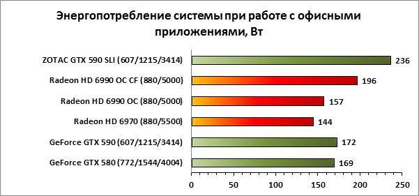 А вот с точки зрения энергопотребления видеокарты NVIDIA всё ещё позади. Судите сами, при игровой нагрузке разница в пользу связки AMD Radeon HD 6990 OC CF в сравнении с ZOTAC GeForce GTX 590 SLI более чем заметна, 73 Вт — не шутка! Обратите внимание, что в некоторых случаях GeForce GTX 580 с одним своим GPU потребляет больше, чем Radeon HD 6990 OC. Кстати, вышеприведенная диаграмма наглядно иллюстрирует, зачем нужны киловаттные блоки питания. Если система с одним жестким диском и не самым горячим процессором потребляет почти 700 Вт, то можете себе представить, сколько потребуется для стабильной работы системы с внушительным RAID-массивом и шестиядерным процессором. Так что существование киловаттников — не просто прихоть маркетологов, они иногда бывают очень кстати.