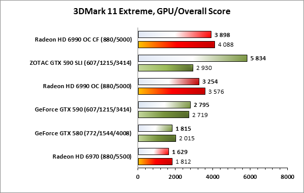 Оценка производительности силами синтетических пакетов проста и незатейлива. Запустил, нажал пару кнопок и получил результат. Как оценка производительности в реальных игровых приложениях такой результат вряд ли пригодится, а вот как инструмент примерного сравнения видеокарт между собой — в самый раз. По результатам видно, что в лёгком режиме ускорители ZOTAC GeForce GTX 590 SLI идут почти наравне с Radeon HD 6990 OC CF, а вот с ростом нагрузки продукты NVIDIA вырываются вперёд. Более того, в сверхтяжёлом режиме — Extreme — топовые ускорители AMD в паре показывают весьма слабый результат, увеличить который не удалось ни после переустановки драйверов, ни после переустановки CrossFireX профилей. Печально, но первый сигнал о недостаточной оптимизации драйверов AMD под Quad CrossFire получен.
