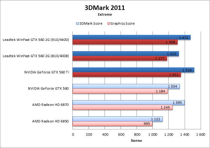 Такое же соотношение наблюдается в 3DMark 2011, только разница между GTX 560 и 560 Ti не столь выражена.