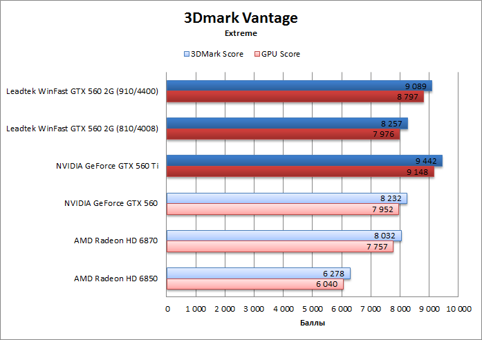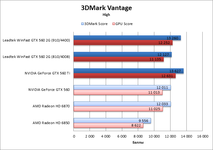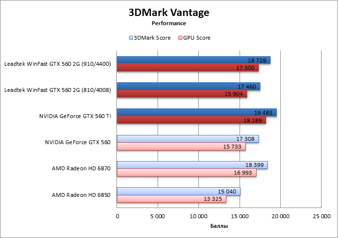 В 3DMark Vantage карта Leadtek оказалась чуточку быстрее, чем референсная GTX 560, но догнать GTX 560 Ti ей не под силу даже с разгоном.