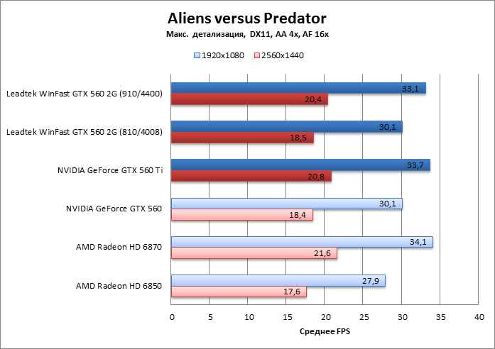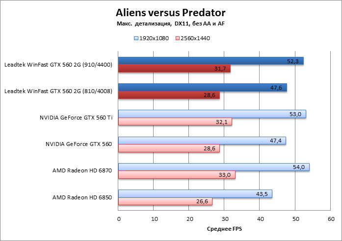 В AvP разгон снова выводит карту Leadtek на уровень GTX 560 Ti и Radeon HD 6870. Дополнительный объем памяти опять не дает ей никакого преимущества над референсным адаптером.