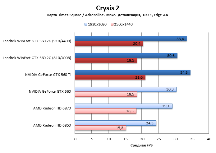 В Crysis 2 значимой разницы между двумя модификациями GTX 560 нет, да и разгон Leadtek не дает значимого эффекта.