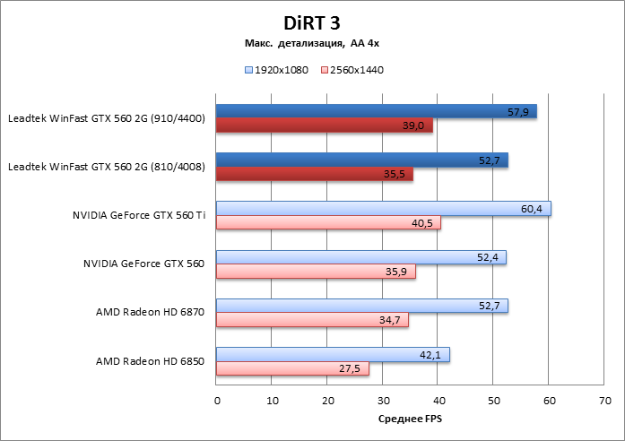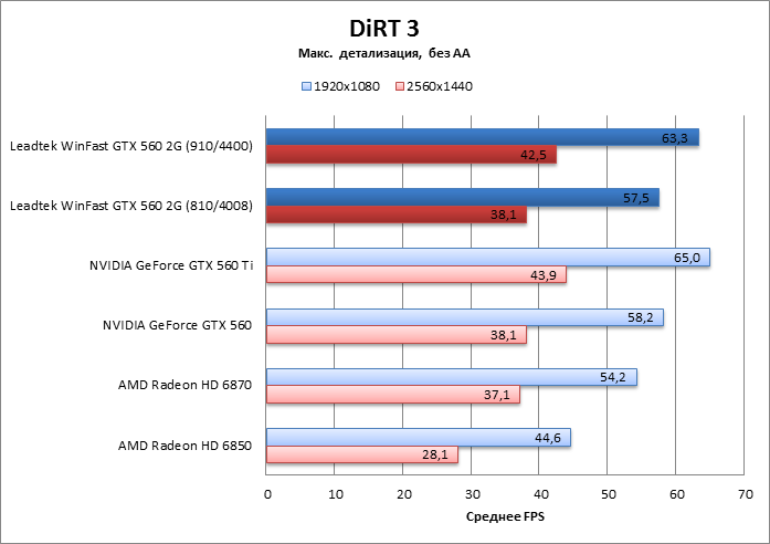 В DiRT 3 разгон также помогает карте Leadtek приблизиться к GeForce GTX 560 Ti. Превосходство над референсным GTX 560 выявить не удалось.
