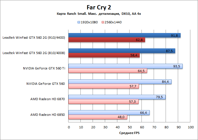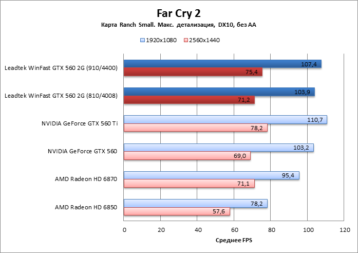 В Far Cry 2 дополнительный гигабайт видеопамяти также бесполезен. Разогнанный GTX 560 почти сравнялся с GTX 560 Ti.