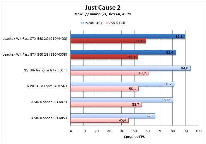 А вот в Just Cause 2 разогнанный GTX 560 легко выходит на уровень «Титаниума». Удвоенный объем памяти на карте Leadtek не производит значимого эффекта.