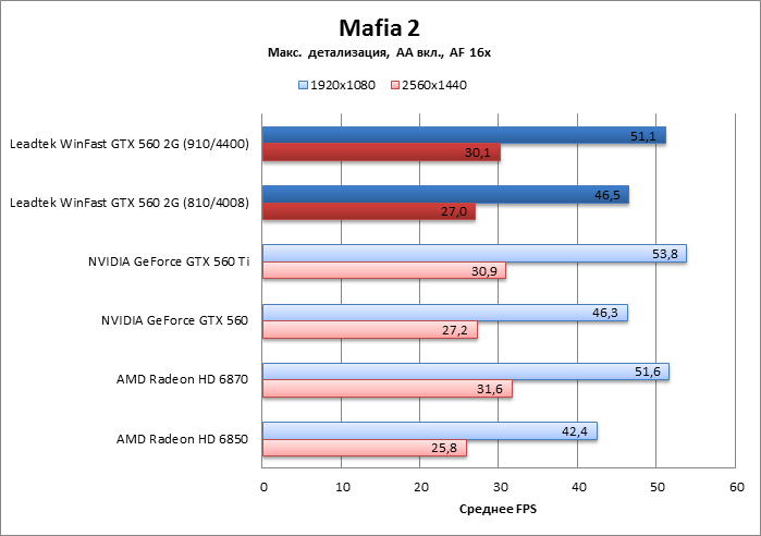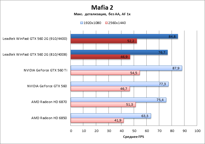 Mafia 2: значимой разницы между Leadtek и референсной картой нет, разгон дает прибавку к производительности, но для того, чтобы сравняться с GTX 560 Ti в тяжелых режимах, ее недостаточно.