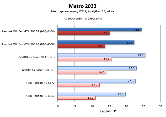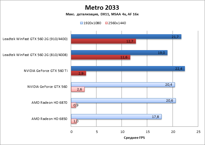 Metro 2033 наглядно показывает, зачем нужны 2 Гбайт видеопамяти. У всех видеокарт в тесте, помимо Leadtek, в режиме 2560х1440 с анизотропной фильтрацией и антиалиасингом частота обновления падает до одного-трех кадров в секунду. При менее требовательных настройках разогнанная карта Leadtek эквивалентна GTX 560 Ti.
