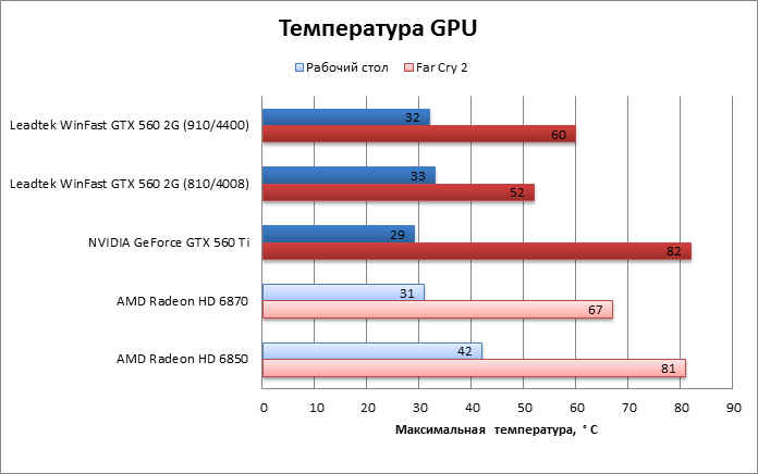 Система охлаждения карты Leadtek отлично справляется с повышенным тепловыделением, и даже при разгоне температура GPU гораздо ниже, чем у GeForce GTX 560 Ti.