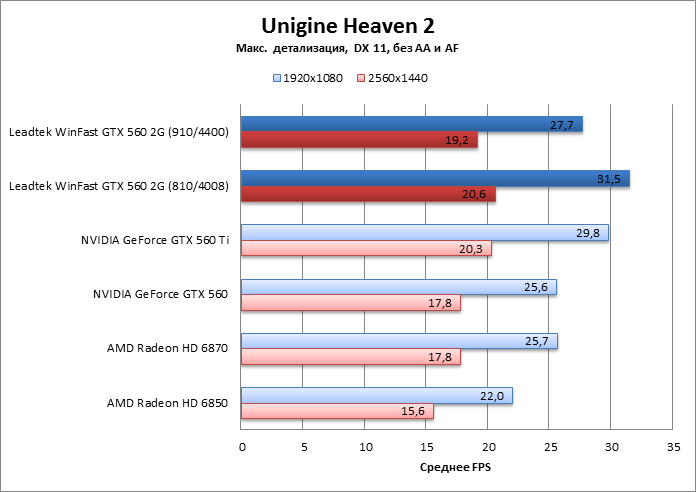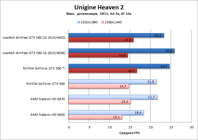 В Unigine Heaven Leadtek заметно превосходит референсную карту. Кроме того, разгон позволил ей обогнать GTX 560 Ti во всех режимах, помимо наиболее ресурсоемкого — 2560х1440 с анизотропной фильтрацией и сглаживанием.