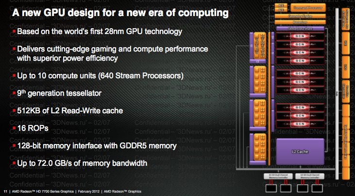Несмотря на потерю большой части вычислительных компонентов, в GPU HD 7770 осталось 1,5 млрд транзисторов — почти в полтора раза больше, чем в HD 6770. Благодаря прогрессивному техпроцессу все это уместилось в компактное ядрышко с TDP 80 Вт.