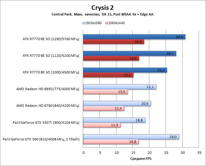 | Crysis 2 + Adrenaline Crysis 2 Benchmark Tool | DirectX 11 | Central Park. Макс. качество, DirectX 11, текстуры высокого разрешения | AF 16x, Post MSAA + Edge AA | 1920х1080 / 2560х1440 |