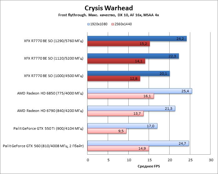 | Crysis Warhead + Framebuffer Crysis Warhead Benchmarking Tool | DirectX 10 | Frost flythrough. Макс. настройки, DirectX 10 | AF 16x, MSAA 4x | 1920х1080 / 2560х1440 |