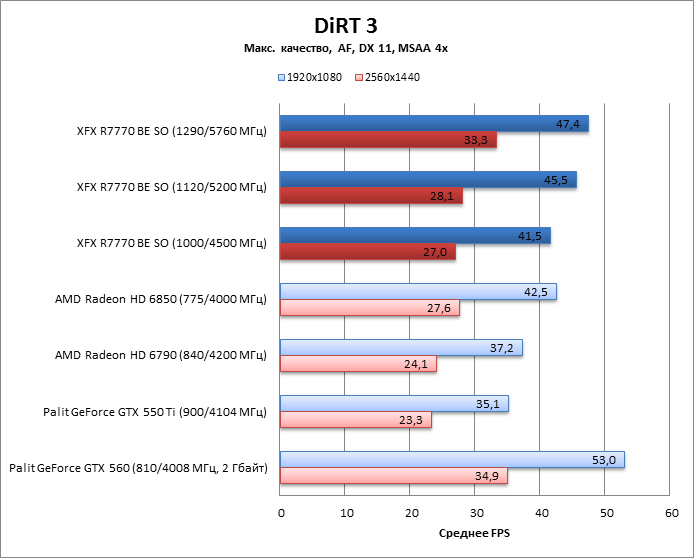 | DiRT 3 + Adrenaline Racing Benchmark Tool | DirectX 11 | Aspen, 8 машин. Макс. качество, DirectX 11 | AF, AA 4х | 1920х1080 / 2560х1440 |