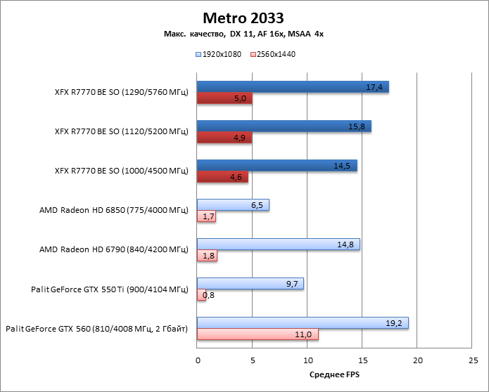 В отличие от прочих, и более современных, игр Metro 2033 на максимальных настройках не по зубам адаптерам среднего уровня, особенно с объемом памяти 1 Гбайт и меньше. Только GeForce GTX 560 в модификации Palit показывает более-менее приемлемый FPS в режиме 2560х1440 благодаря 2 Гбайт GRAM.