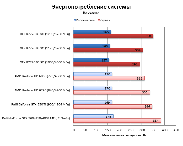 Энергопотребление карты также значительно меньше, чем у обоих адаптеров AMD прошлого поколения (HD 6790 и HD 6850), не говоря уже о GeForce GTX 550 Ti и GTX 560. При максимальном разгоне R7770 немного превосходит GTX 550 Ti.