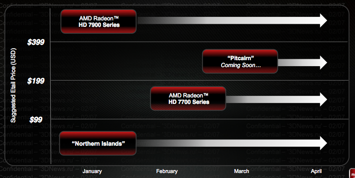 Продвигать GCN в карты низшего ценового уровня AMD не планирует. Здесь продолжат существование адаптеры семейства Northern Islands (возможно, перемаркированные в модели семитысячной серии). Кроме того, скорый выход процессоров Trinity с интегрированным ядром GCN сделает бюджетную графику дискретного форм-фактора совершенно лишним компонентом для платформы AMD.