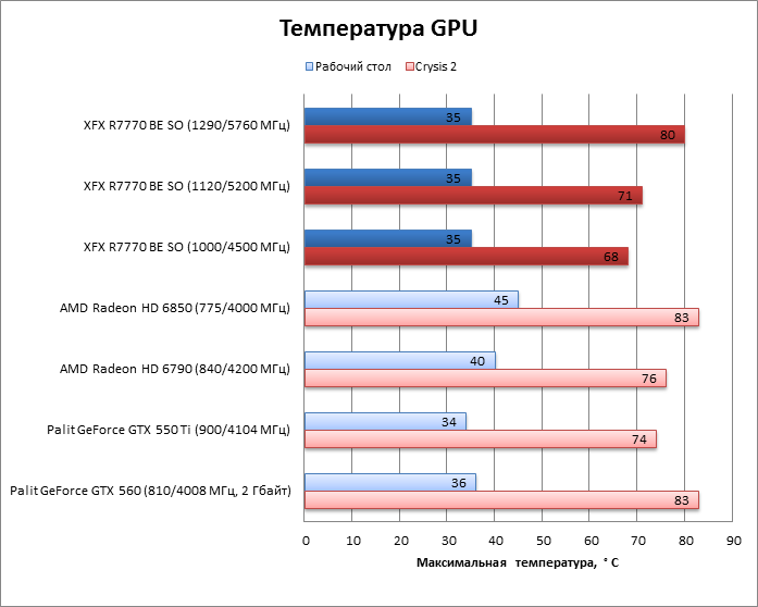Температура графического процессора XFX R7770 BE SO под нагрузкой меньше, чем у всех прочих видеокарт, принявших участие в тестировании, как на референсных частотах, так и с заводским разгоном. В режиме предельного оверклокинга температура выросла еще на 8 градусов (кулер, напомним, работал на полной скорости).