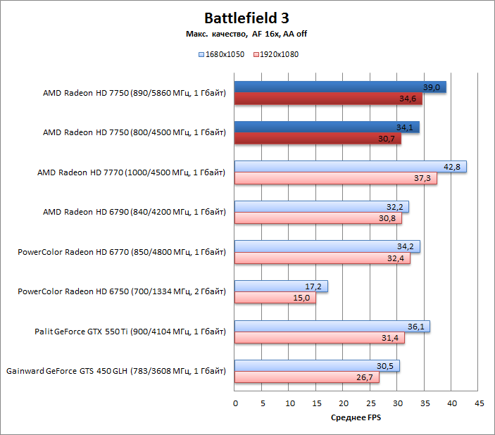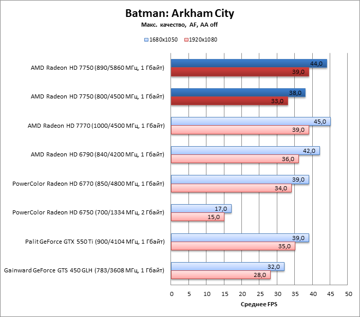 | Batman: Arkham City. Встроенный бенчмарк | DirectX 11 | Макс. качество | AF, AA off | 1680x1050 / 1920х1080 |