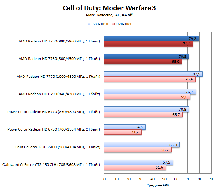 Radeon HD 7770 оказался не менее успешным среди карт своей ценовой ниши, чем Radeon HD 7950/7970 в категории high-end. В большинстве игр он по производительности сопоставим с картой классом выше из прошлого поколения — HD 6850, при скромном TDP 80 Вт. Если сравнивать с продуктами NVIDIA, то HD 7770 попадает в зазор между GeForce GTX 550 Ti и 560, ближе к последнему. Производительности HD 7770 хватает на то, чтобы играть в довольно-таки ресурсоемкие игры с полноэкранным сглаживанием в разрешении 1920х1080 на грани комфортного фреймрейта, а новые и популярные, но не столь технически продвинутые игры вроде Call of Duty: Modern Warfare 3 и вовсе летают.