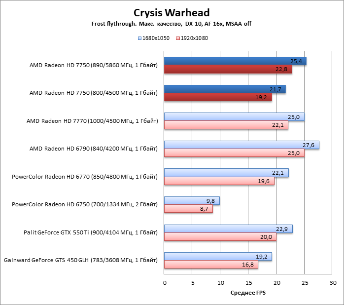 | Crysis Warhead + Framebuffer Crysis Warhead Benchmarking Tool | DirectX 10 | Frost flythrough. Макс. настройки, DirectX 10 | AF 16x, AA off | 1680x1050 / 1920х1080 |