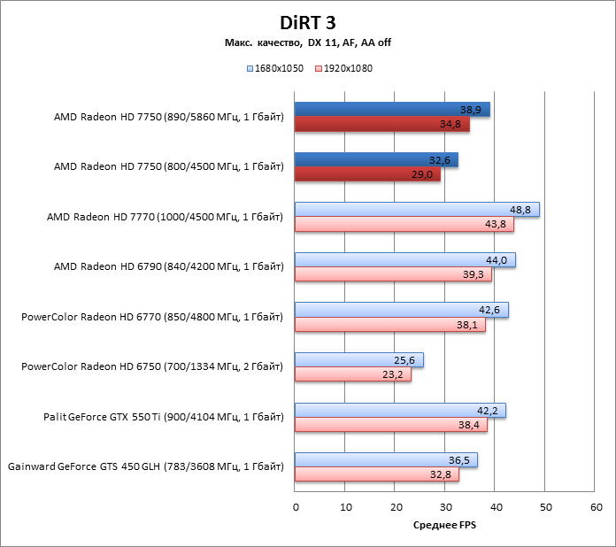 | DiRT 3 + Adrenaline Racing Benchmark Tool | DirectX 11 | Aspen, 8 машин. Макс. качество, DirectX 11 | AF, AA off | 1680x1050 / 1920х1080 |