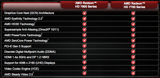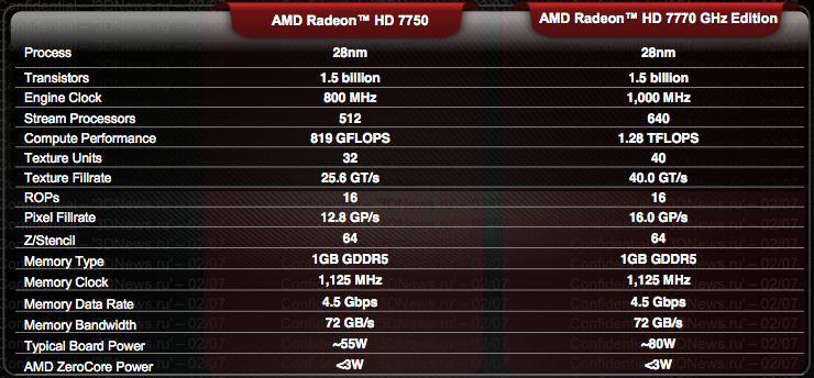 Напомним, что Radeon HD 7770 и HD 7750 построены на базе той же архитектуры Graphics Core Next, что и Radeon HD 7950/7970, и обладают всеми опциями старших карт: интерфейс PCI-E 3.0, поддержка разрешений выше 2560х1440 и, что более актуально, функции энергосбережения PowerTune и ZeroCore, о которых подробно рассказано в обзоре Radeon HD 7970.