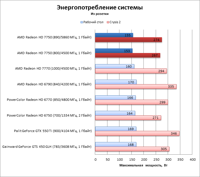 Тест энергопотребления расставляет все на свои места. Radeon HD 7750 оказался самой экономичной картой среди всех участников, хотя нужно отметить, что система с HD 6750 потребляет лишь немногим больше. Разница с остальными картами более заметна. Разгон у HD 7750 получился небольшой, потому и прирост мощности в этом случае невелик.