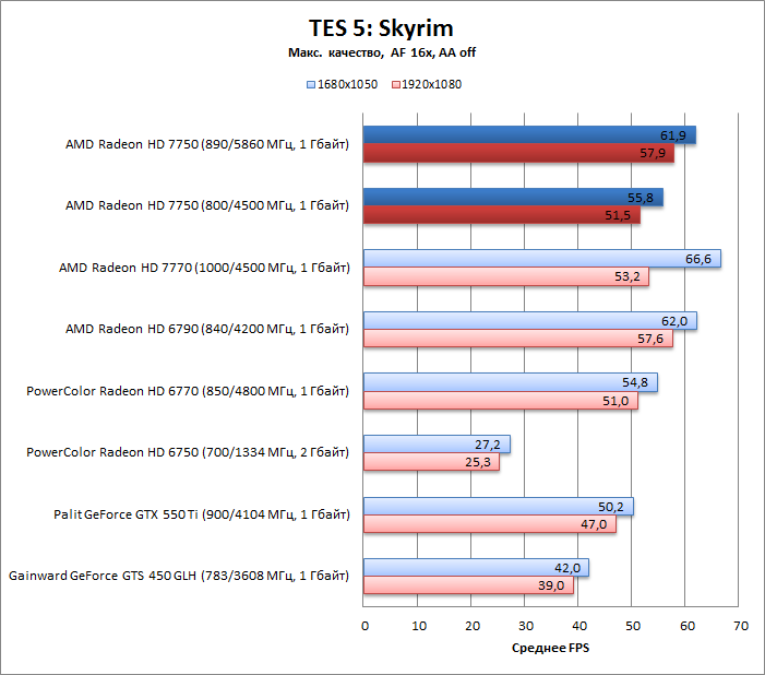 Несмотря на то, что Radeon HD 7750 и HD 7770 основаны на одном GPU и в модельном ряду AMD стоят на одной полке, разница между ними довольно велика. HD 7770 — это самый низ «среднего класса», карта, с которой можно играть в современные игры при максимальных настройках на грани комфортного фреймрейта. HD 7750, как показали бенчмарки, скорее бюджетная модель, которая вынуждает идти на компромисс между качеством и быстродействием. Ресурсоемкие игры она кое-как тянет, но уже без полноэкранного сглаживания. В линейке AMD прошлого поколения сравнимой производительностью обладает HD 6770. До уровня HD 6790 новинка не достает. Эквивалент среди карт NVIDIA — GeForce GTX 550 Ti. Такое впечатление, что спецификации HD 7750 подбирали именно таким образом, чтобы не опуститься ниже последнего. Для оверклокинга HD 7750 походит плохо — нет возможности регулировать напряжение на GPU, питания от шины PCI-E не хватает. В результате хорошо разгоняется только видеопамять, а у процессора запас частоты небольшой.