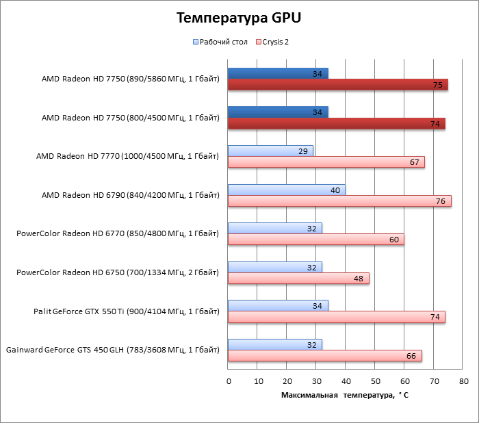 Radeon HD 6790 и GeForce GTX 550 Ti греются под нагрузкой примерно так же, как HD 7750.