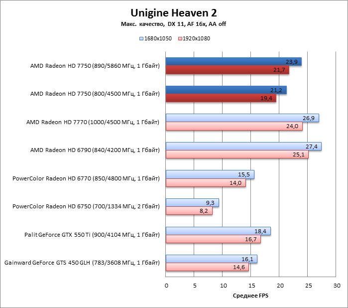| Unigine Heaven 2 | DirectX 11 | Макс. качество, DirectX 11, тесселяция в режиме Extreme | AF 16x, AA off | 1680x1050 / 1920х1080 |