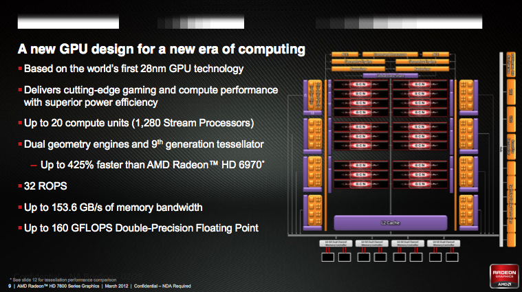 Графический процессор Pitcairn, установленный в Radeon HD 7850/7870, как и прочие представители серии Southern Islands, основан на новой архитектуре Graphics Core Next (GCN). Она существенно отличается от архитектуры VLIW5/VLIW4, которая использовалась во всех предыдущих GPU AMD/ATI, начиная с серии Radeon HD 2000. GCN обеспечивает чипам AMD большой прирост производительности и поддержку массы новых технологий: PCI-E 3.0, DirectX 11.1, новых версий интерфейсов DisplayPort и HDMI с повышенным разрешением, мощных функций энергосбережения и так далее. За подробным обзором GCN и ее особенностей отсылаем вас к статье про Radeon HD 7970. Все они есть и в картах HD 7850/7870, за исключением, пожалуй, полноценной поддержки вычислений с плавающей точкой двойной точности (FP64). Совместимость с этим форматом на уровне API есть, но операции выполняются на скорости 1/16 от FP32.